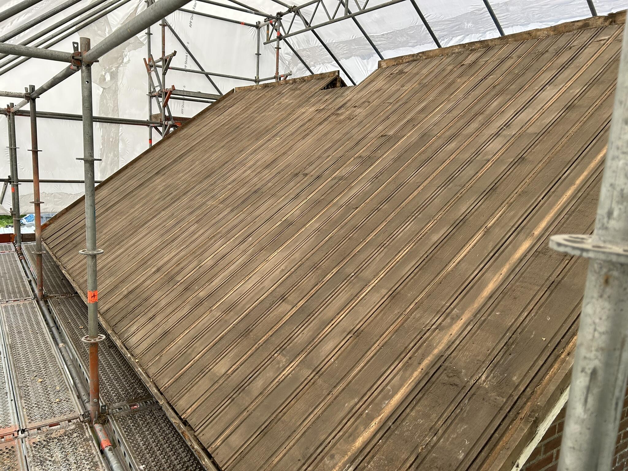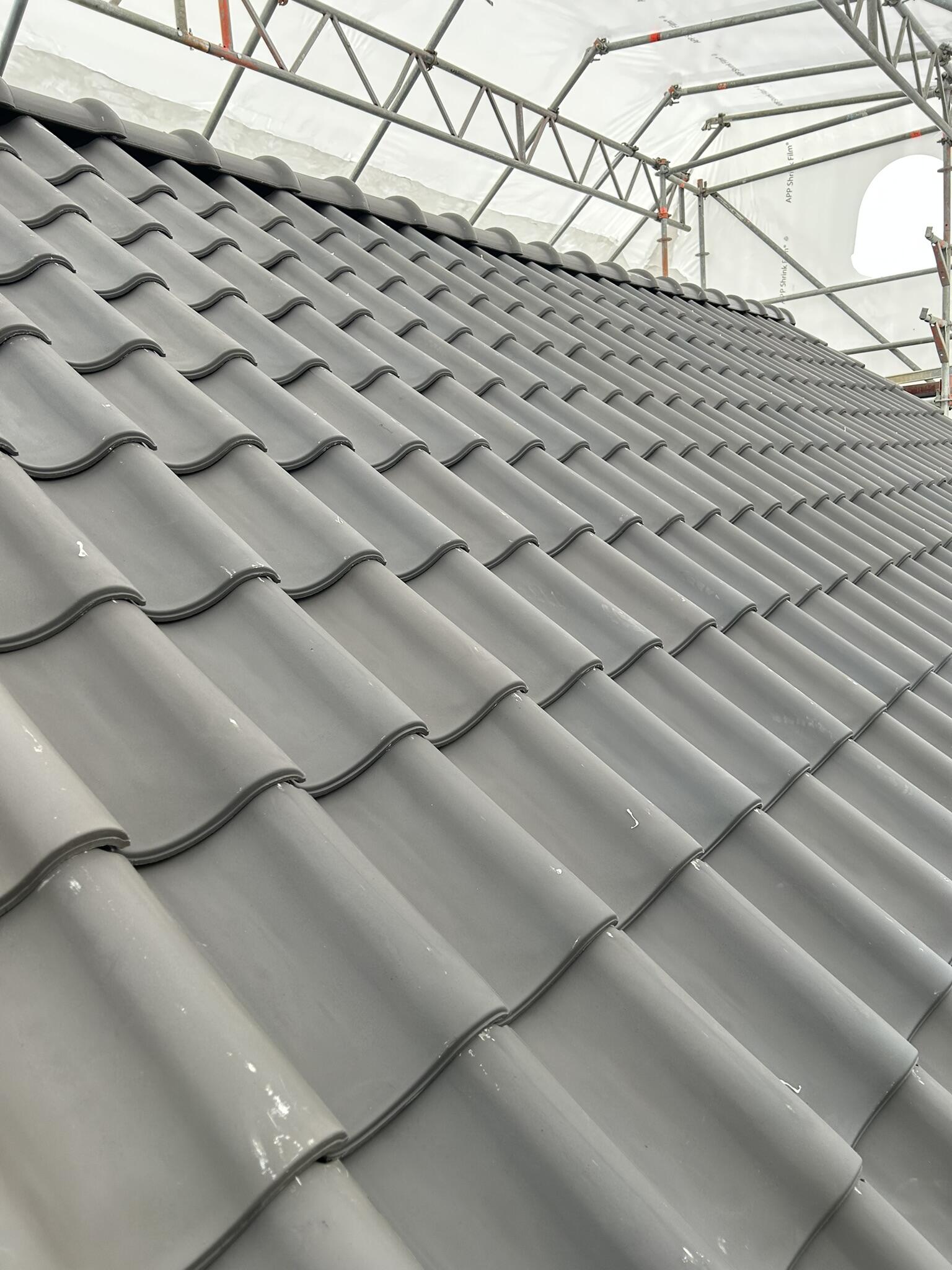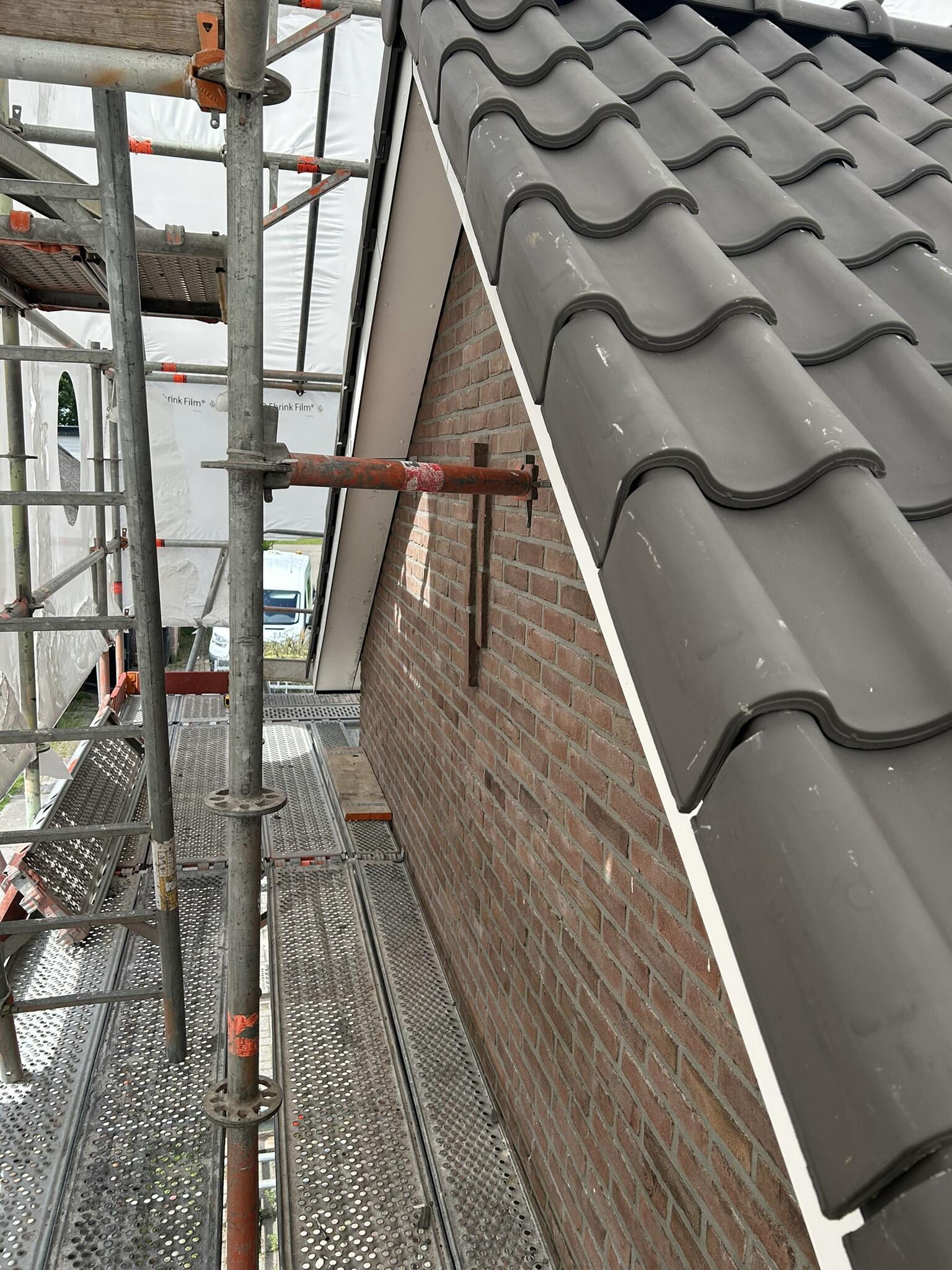 Deze week hebben we het dak van een transformatorhuis in Havelte gerenoveerd. Het gebouw stond in de steigers en is afgedekt om waterschade te voorkomen. Het dak is vernieuwd met dampdoorlatende folie, nieuwe latten en dakpannen, en de houten windveren zijn vervangen door onderhoudsvrije Trespa. Een nette, duurzame oplossing waar het weer jaren mee vooruit kan.