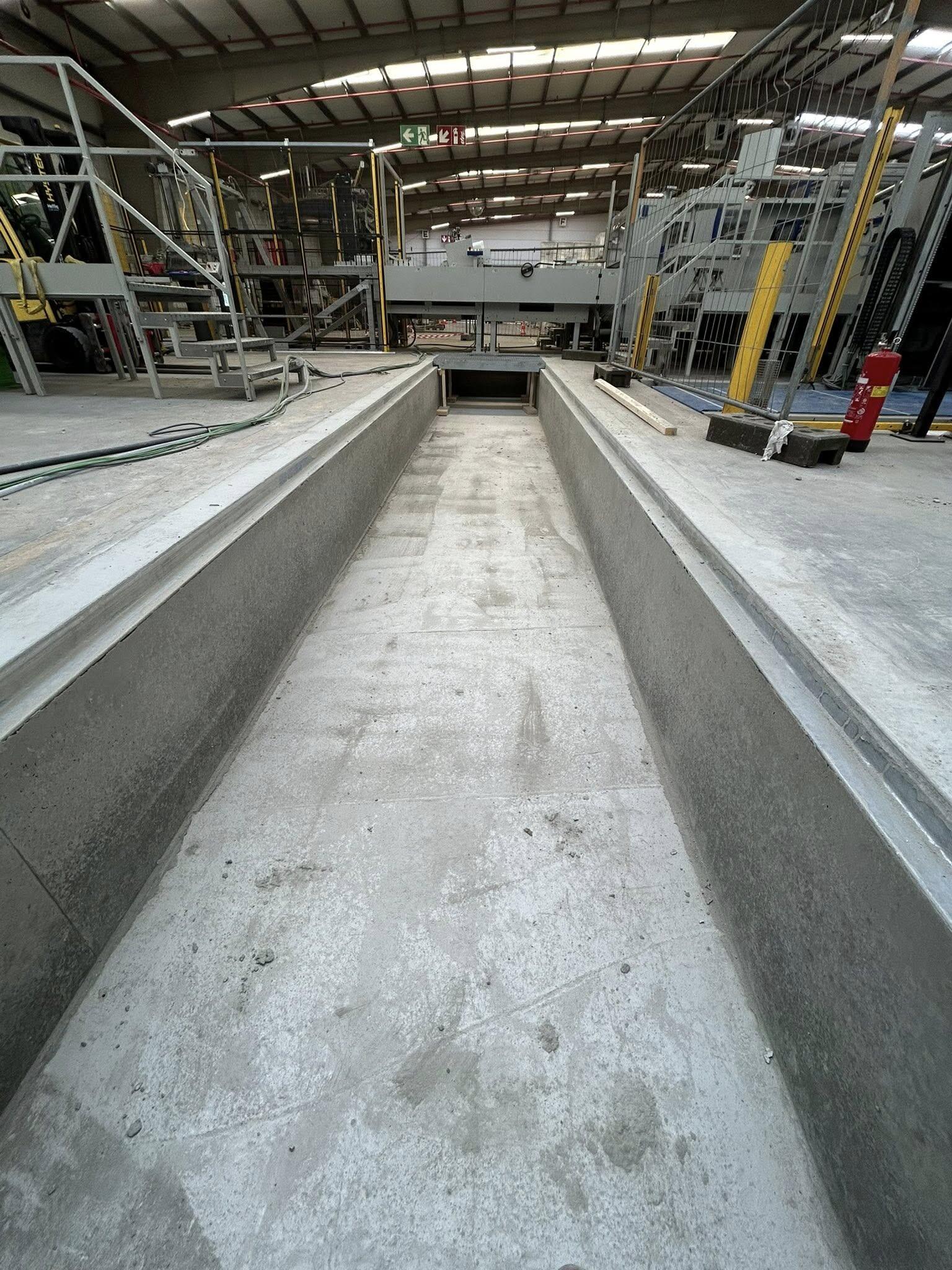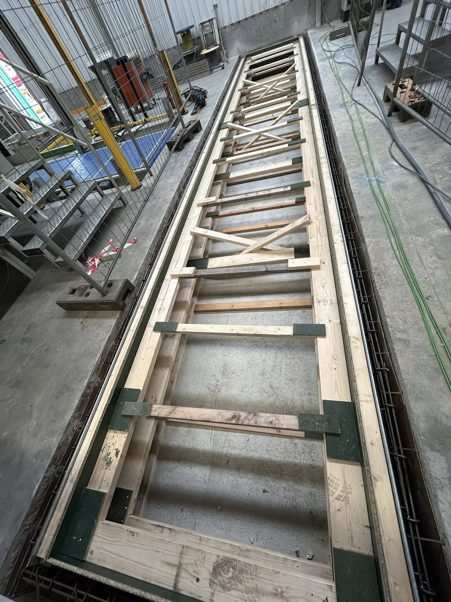 Maatwerk betonkelder van 11 m lang, 2 m breed en 0,8 m diep als fundering voor een transportband van een papiermachine. Voltooid in het werk: bekisting, wapening en storten, geen prefab. Strakke planning en uitvoering geleid tot een efficiënte oplevering en tevreden klant.